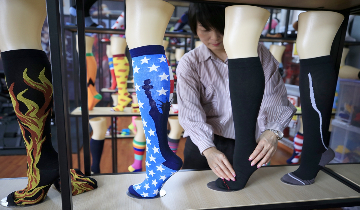 Last year, the company exported around 100 million yuan ($14.72 million) worth of compression socks, mostly to the US and Europe. So far in 2020, the company's export sales surged by around 40 percent, as a result of its unique cost advantages and a rising trend of home fitness during the pandemic.