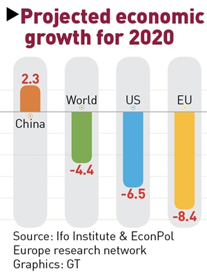 Among the world's major economies, only China is expected to achieve a positive growth of 2.3 percent this year, while the economies of the US and EU are expected to shrink by 6.5 percent and 8.4 percent, respectively, according to a research report released by Germany's Ifo Institute and the EconPol Europe research network on Wednesday.