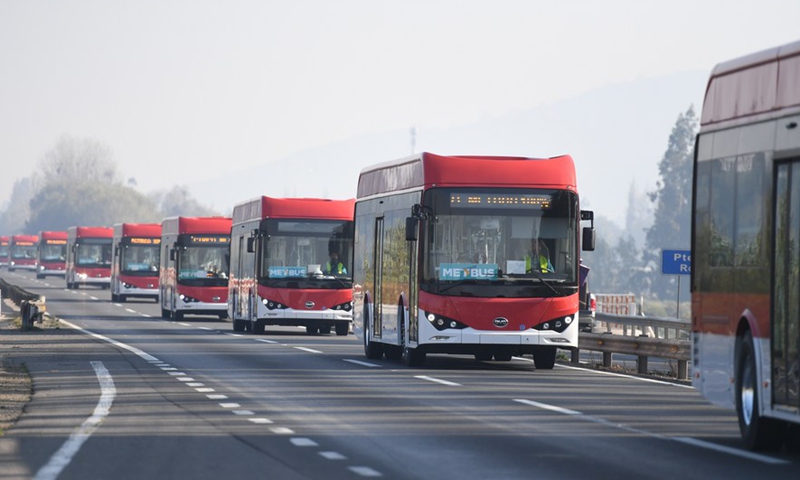 Photo taken on June 6, 2020 shows the electric buses manufactured by Chinese company BYD heading for Santiago from the Port San Antonio in Chile. (BYD Company Limited/Handout via Xinhua)